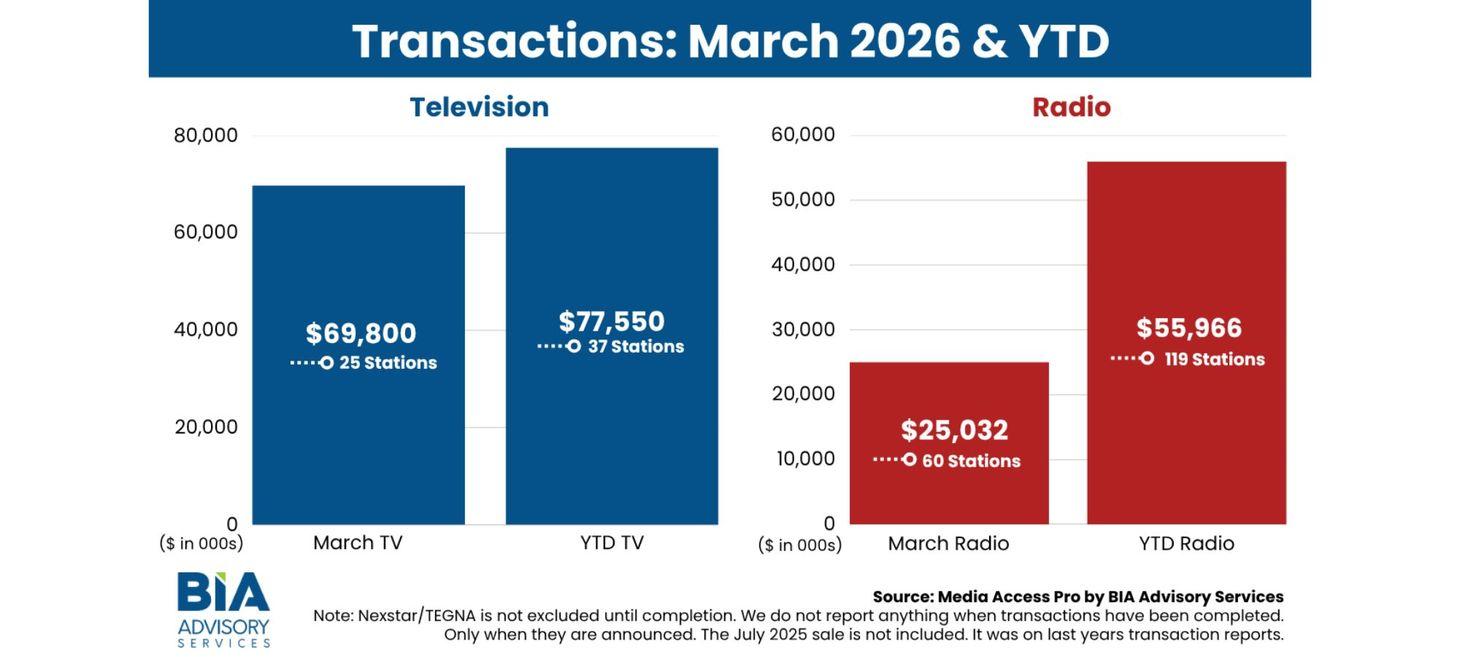 As shown in our monthly transaction chart, March delivered a measured but meaningful set of broadcast transactions, totaling approximately $69.8M in television deals and $25M in radio.